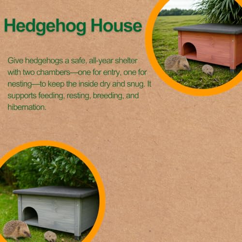 The hedgehog house features a clever two-chamber layout, giving hedgehogs a dry entry area and a separate nesting space. This design keeps them protected from damp and allows a cosy, secure place to rest, raise young, or hibernate. It mimics natural burrows, helping hedgehogs feel safe and comfortable year-round.