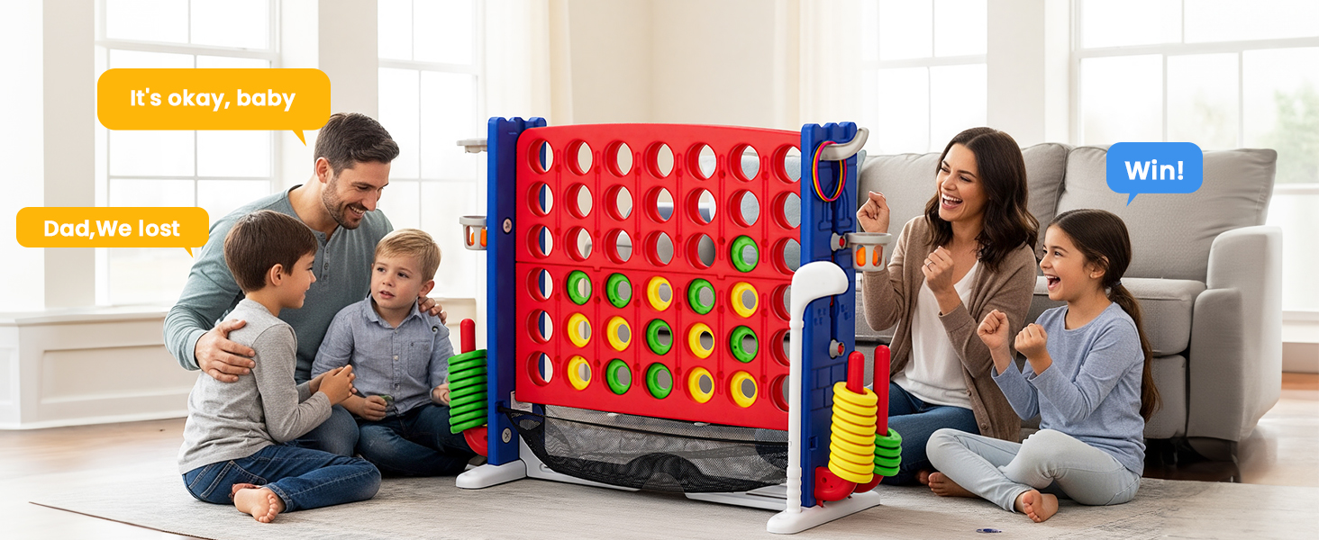 【4-in-1 Giant Outdoor Game Set】 This upgraded Giant Connect 4 combines Four-in-a-Row, Basketball Shooting, Golf, and Ring Toss into one exciting package! Perfect for kids, teens, and adults to enjoy together, it offers endless fun while enhancing social skills, problem-solving, hand-eye coordination, and strategic thinking.