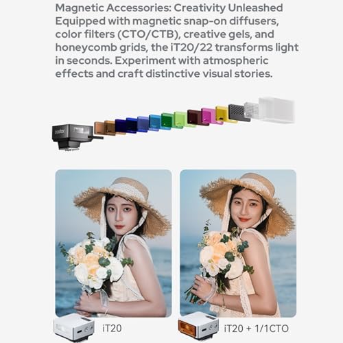 - Magnetic Accessories for Creative Lighting: Includes magnetic diffuser and CTO filters (1/1 & 1/2 stop) for flexible light control. Optional magnetic accessories (softboxes, color gels, etc. — sold separately) for diverse effects.