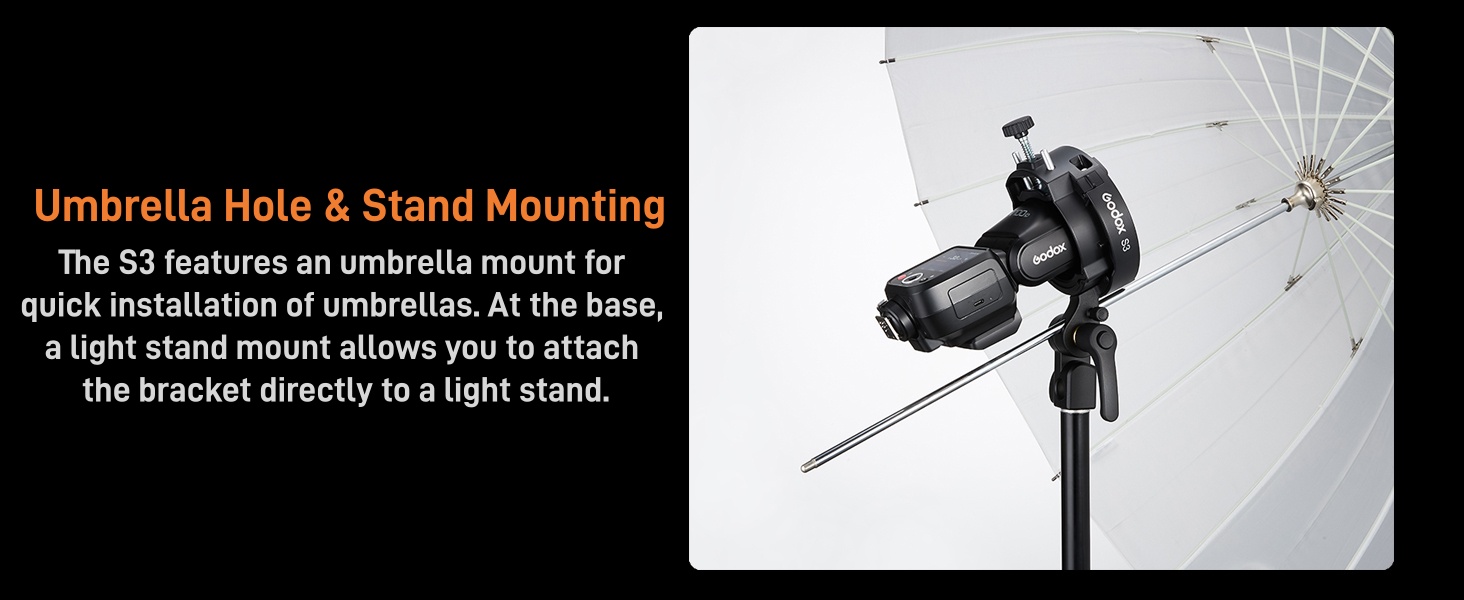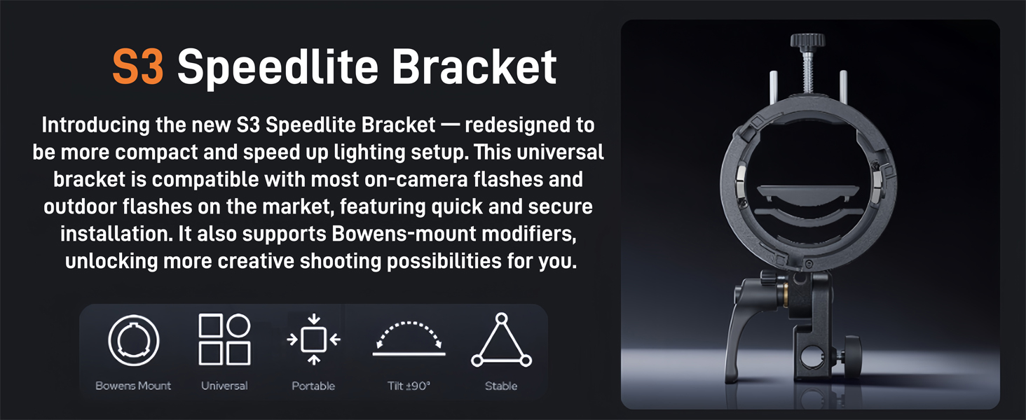 Godox S3 Speedlite Bracket (a portable upgrade from the S2) boasts a compact integrated design, no assembly, ready to use, smaller, lighter, foldable for pocket storage, and portable. It’s universal for most on-camera/outdoor flashes, with quick installation and Bowens-mount support to shooting.