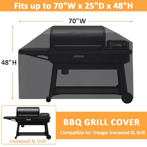 - Perfect Compatibility: The Traeger pellet series grill cover is specifically designed to fit the Traeger Ironwood XL electric wood pellet grill cover TFB93RLG series grills models, 1 pack 600D outdoor grill cover measure is 70"W x 25"D x 48"H, replacement for Traeger grill accessories BAC647 grill cover, ensuring a perfect fit and reliable protection for your Traeger Ironwood XL series grill, as well as other similar size grills