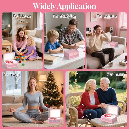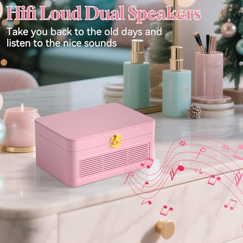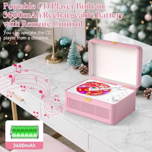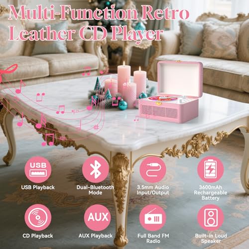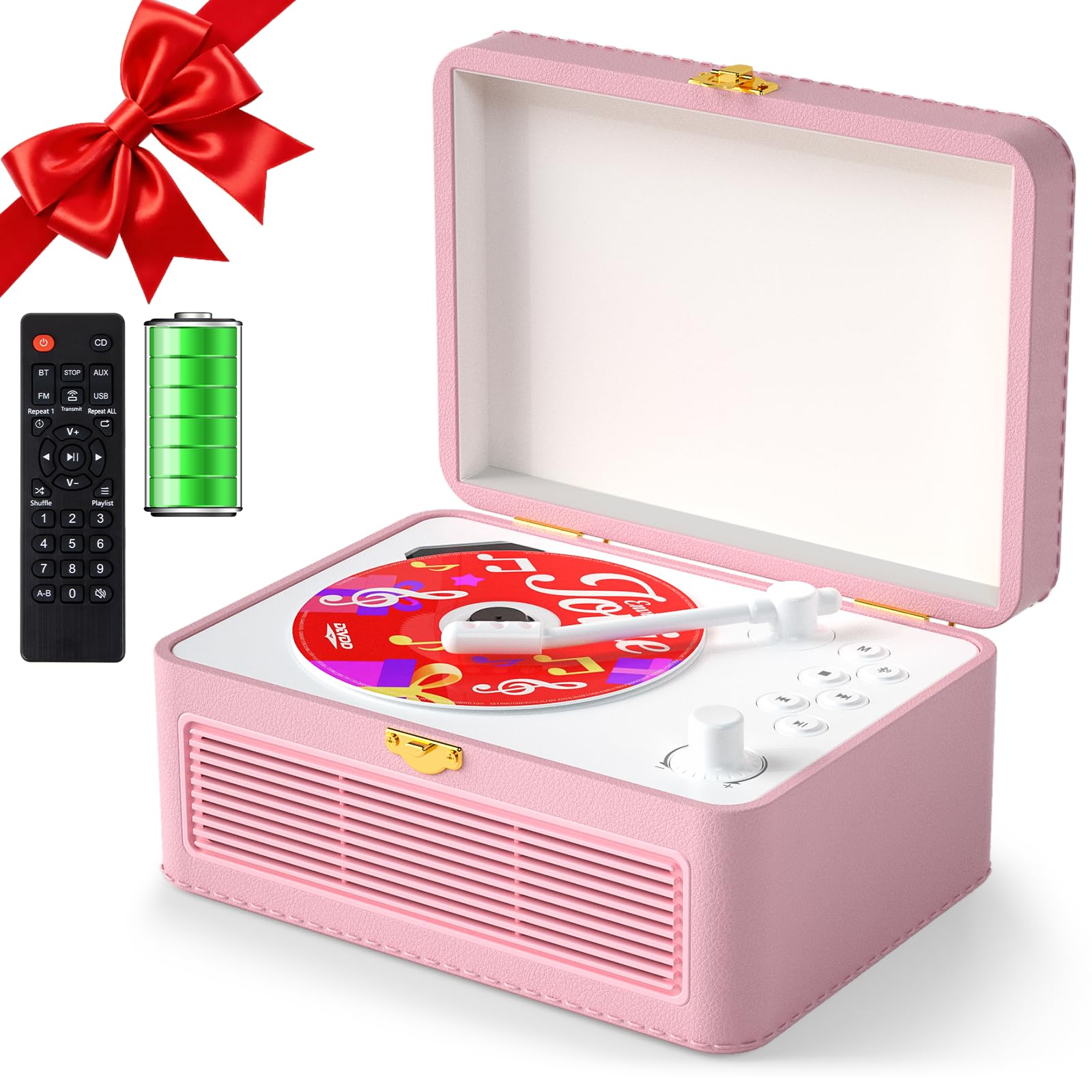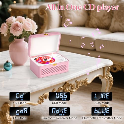 Gueray CD Player with Speakers HiFi Stereo Sound CD Players Bluetooth for Home, Retro CD Players FM Radio Support USB/AUX/Type-C Playback for Audio Books(Pink)