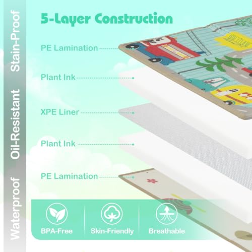 - ✔5-LAYER CONSTRUCTION- This baby play mat boasts a 5-layer structure that includes PE lamination, plant ink, XPE liner, plant ink and PE lamination. Skin-friendly and breathable, the soft crawling playmat creates a BPA-free and cushioned environment, making it an ideal choice for your little ones.