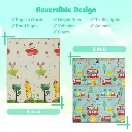 - ✔DOUBLE-SIDED PATTERNS- Featuring a reversible design, this portable floor mat exudes rich patterns on both sides. The visually stimulating patterns, such as English words, a height ruler, traffic elements, and animals, help engage and educate your baby, promoting sensory development and cognitive skills.