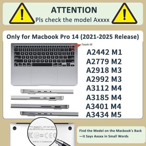 - 【Compatibility】ONLY compatible with MacBook Pro 14 inch case with retina display & touch id,(Model A2442 M1/A2779 M2/A2918 M3/A2992 M3/A3112 M4/A3185 M4/A3401 M4 release 2025-2021). Please check the model "Axxxx" on the back of the laptop and order the correct model case. Not fit for any other models.