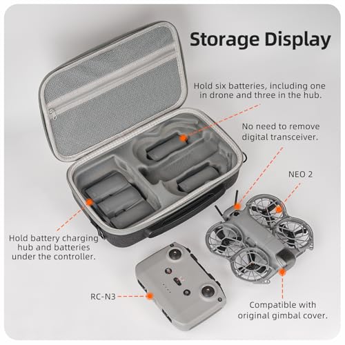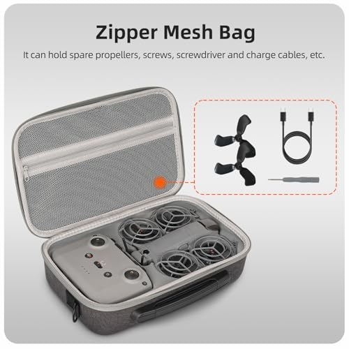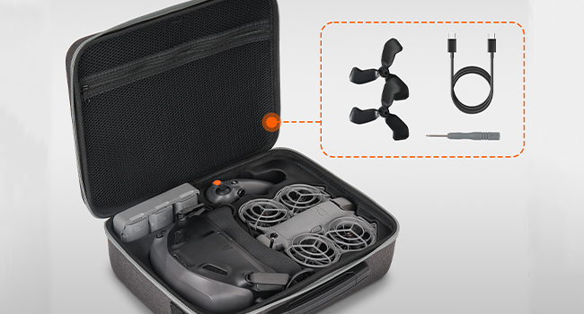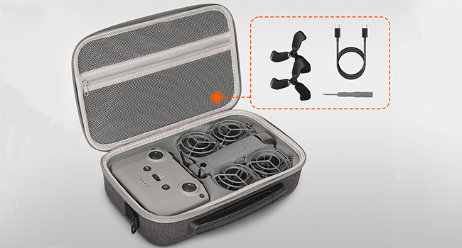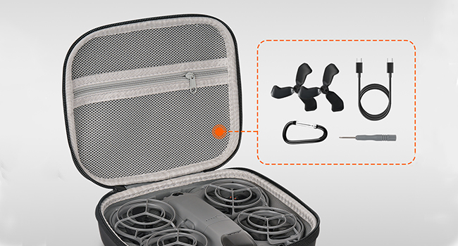 Multifunctional storage bag can hold for DJI NEO 2 drone and its original protective cover, compatible with RC-N3 remote control, battery and charger. The zipper mesh bag can hold power cord, propeller, screwdriver, propeller and other accessories.