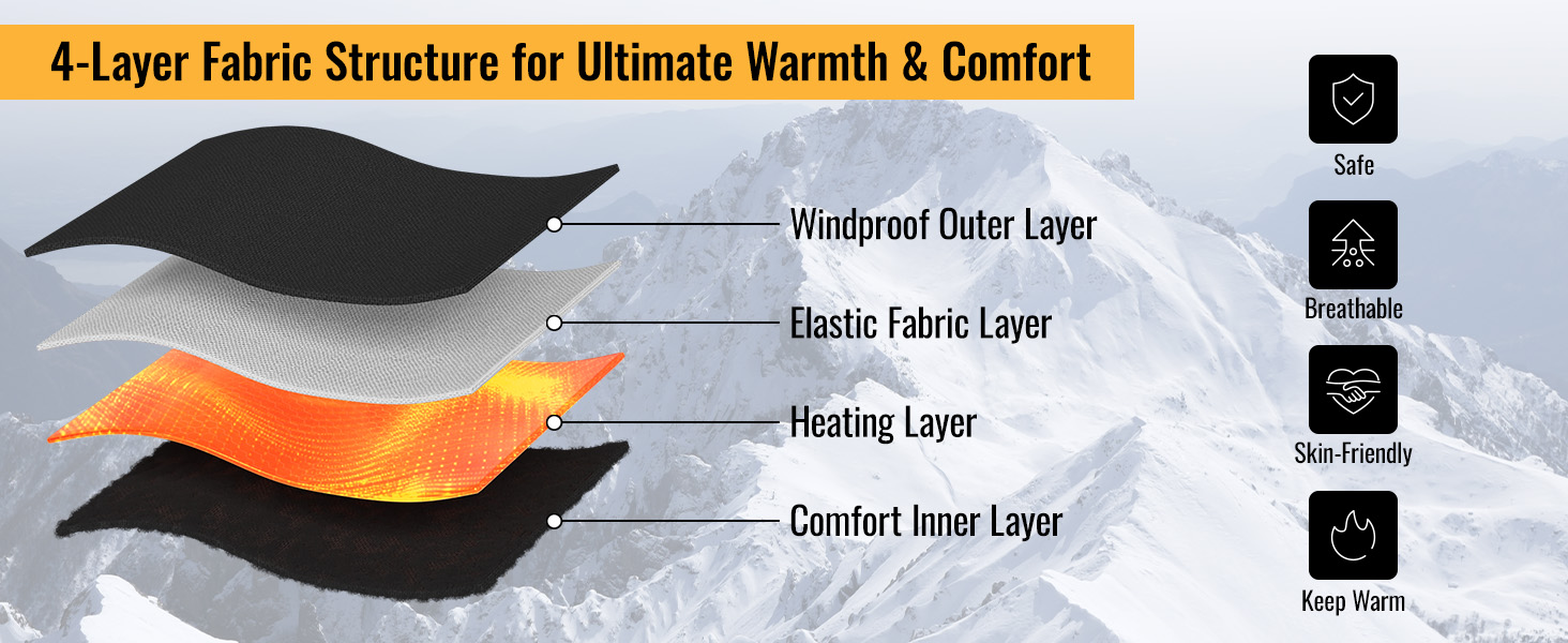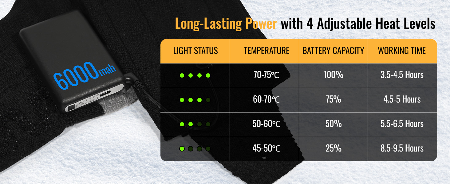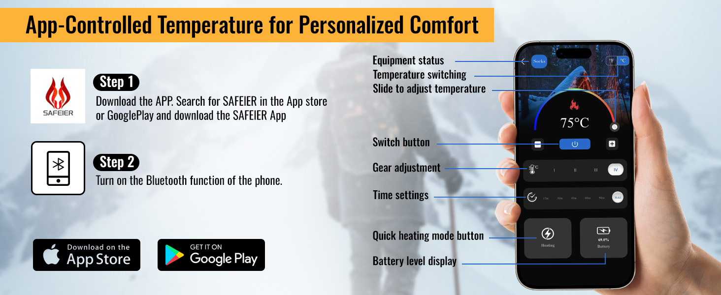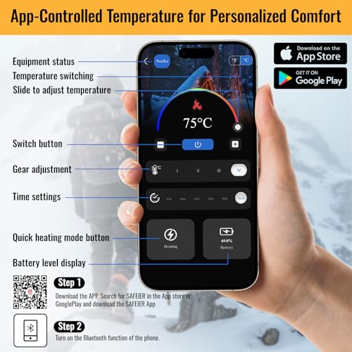 - 4 Heat Levels & Precise Temperature Range: Switch between four adjustable levels: 45–50°C, 50–60°C, 60–70°C, and 70–75°C. The APP allows you to fine-tune the temperature and set auto-off timers for safety and energy efficiency. Enjoy up to 9.5 hours of steady warmth, perfect for any cold-weather adventure.