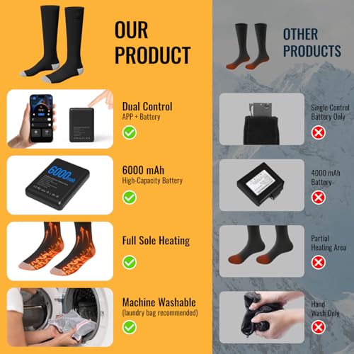 Heated Socks for Men Women, 6000mAh Rechargeable Electric Heated Socks with APP & Battery Dual Control & 4 Heat Levels, Machine Washable Foot Warmers with Laundry Bag for Skiing Hiking Camping