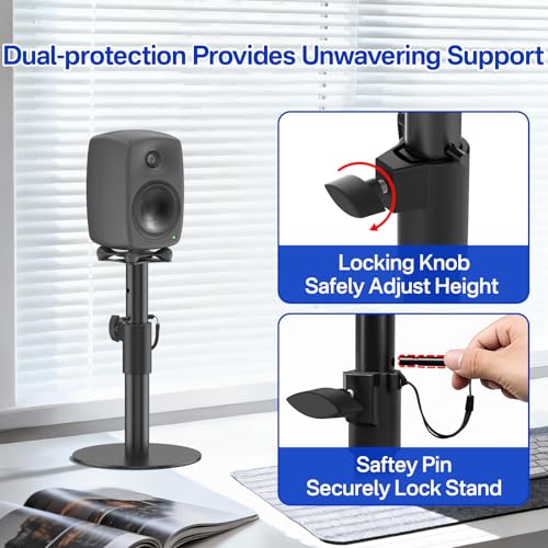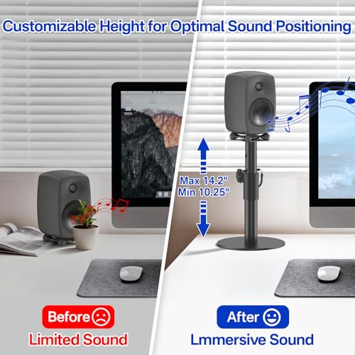 Customizable Height – This adjustable desktop speaker stands offers a height range from 10.35" to 13.8". This allows you to easily position your speakers at ear level for superior sound quality. Tool-free knob adjustment makes it simple to customize the height of your monitor speaker stand for an immersive audio experience in any scenario.