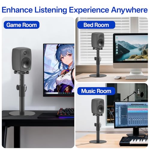 Space Saving — The speaker stand for desk elevates your speakers to free up valuable desk space, creating a cleaner and more efficient space. Ideal for use in a variety of settings such as game rooms, music rooms, living rooms, and conference rooms.