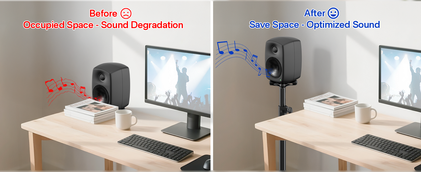 Save Space – This rear speaker stands can effectively save desktop space and reduce desktop vibration interference by placing the speakers in an elevated position, making the sound clearer and more transparent, bringing a more immersive listening experience. Let you enjoy a better audio experience while keeping your desktop clean and tidy!
