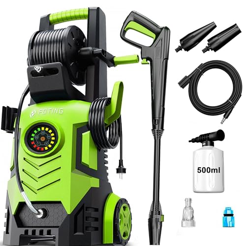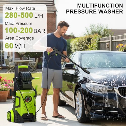 Powerful Cleaning: FOTING power washer delivers a robust max. pressure of 100-200 bar and a flow rate of 280-500 l/h, designed to effectively clean cars, fences, patios, and driveways with an area coverage of up to 60㎡/h