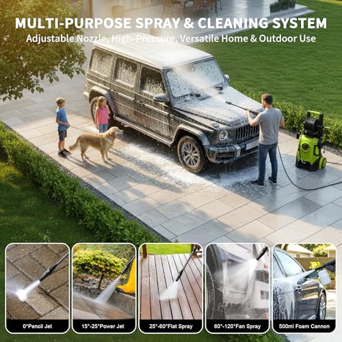 6 Spray Modes: Comes with a Lotus Nozzle for concrete and tires, and an adjustable Rotary Nozzle(4 modes) for fences, patios, and driveways. Features a 500ML detergent tank and an adapter for easy water inlet connection