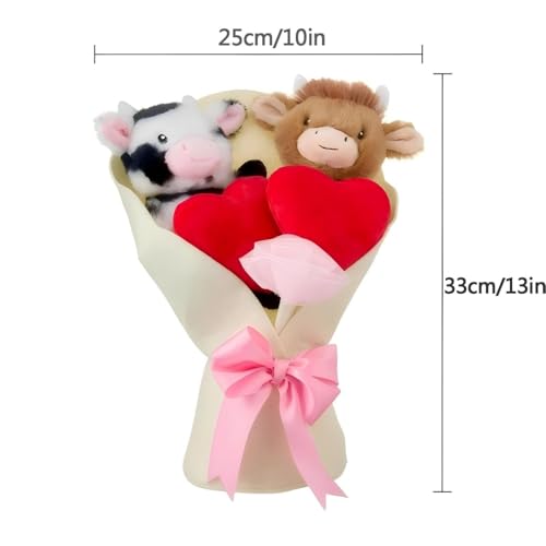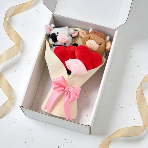 - 【Adorable Valentine’s Twist on Classic Bouquets】Skip traditional flowers! This 13” Hyland Cow Bouquet Plush features two cuddly cow stuffed toys (one black-and-white, one brown) holding red heart accents, wrapped in soft white felt with a chic pink satin bow – the cutest alternative to floral arrangements for Valentine’s Day, highland cow valentines day plush gift.