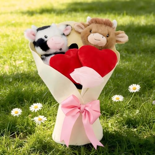 - 【Ultra-Soft & Cuddly Design】Made with plush, huggable fabric, these cow toys are as cozy as they are charming. The bouquet’s soft felt wrapping and smooth satin bow add to its tactile appeal, making it perfect for snuggling, displaying as decor, or gifting to cow lovers and romantic partners, highland cow valentines day plush gift.
