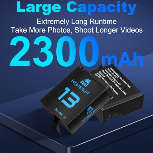 - 【More Batteries, More Photos】Triple your camera runtime with a complete backup package including 2x 2300mAh Hero 13 replacement batteries and 3-channel battery charger with cover. To release out the full capacity of our battery, we suggest you do several discharge and charge cycles (like 5 times). The capacity will increase to normal capacity.