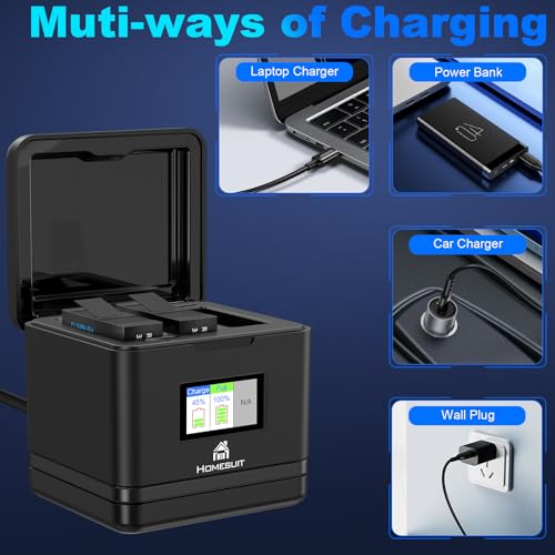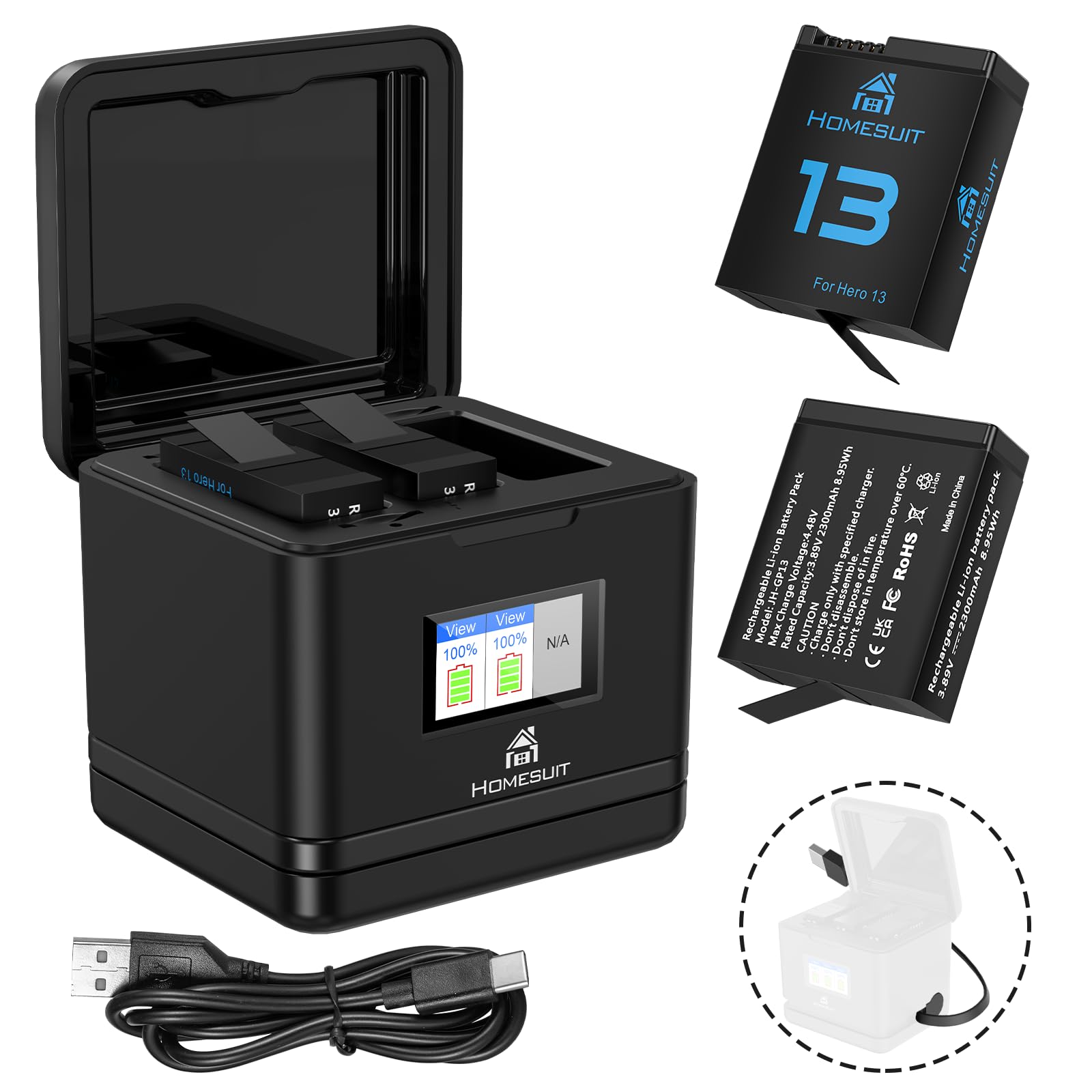 Homesuit Enduro Rechargeable Batteries 2300mAh & 3-Slots LCD Battery Charger for HERO13 Black Replacement Battery Accessory with Type-C (2-Pack)