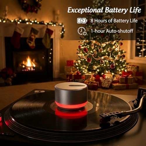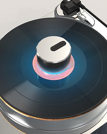 - Dynamic 9-Color LED Ambience + Auto Safety: Enjoy mesmerizing color transitions from the 360° LED halo surrounding the stabilizer. It features different lighting modes, automatic color cycling, and a 1-hour auto shut-off for convenience. When docked on its charging base, it creates an elegant display piece for your vinyl space, such as your record shelf and turntable.