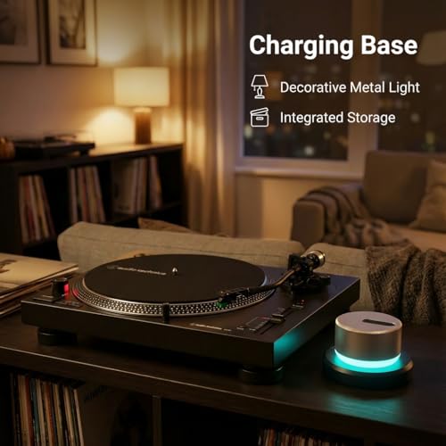 - Premium Protection & Luxury Build: This product boasts a proprietary anti-fingerprint non-magnetic aluminum alloy mat finish, an archival-grade felt pad to prevent label discoloration, and a leather power button for tactile elegance. The included charging base with four indicator lights ensures easy storage & charging, and doubles as an ambient light lamp for your record shelf or record player stand.