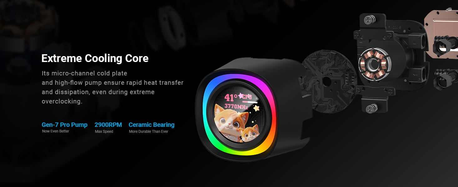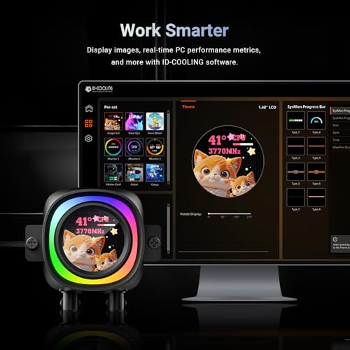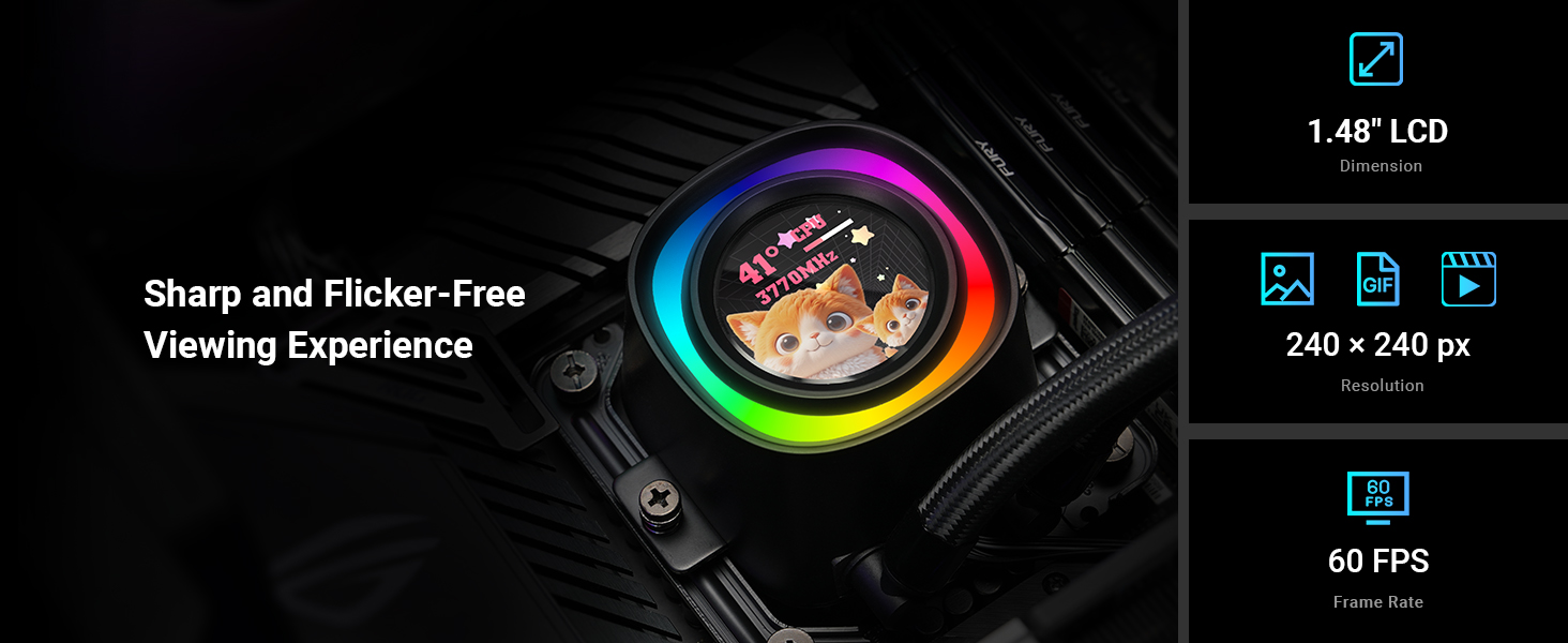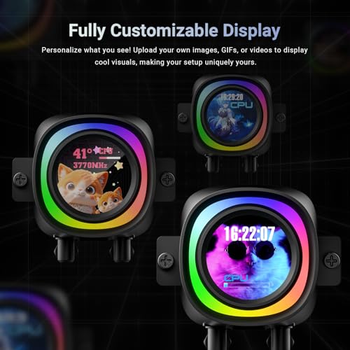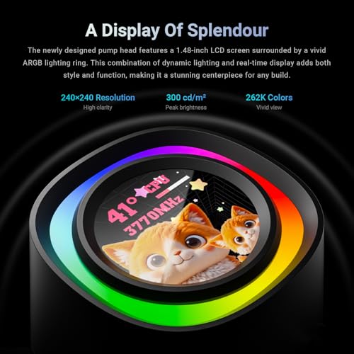 【Striking Visuals & Personalisation】Features a built-in 1.48″ 240×240 px full-colour LCD screen (18-bit / 262K colours) plus ARGB lighting ring, so you can display system stats, images, animations, or custom graphics right on your CPU cooler.
