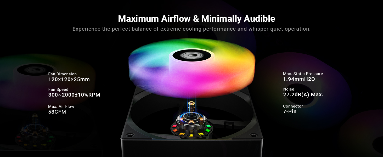 【Optimised Pump & Fans for Efficiency & Low Noise】The pump spins up to 2,900 RPM (±10%) with a ceramic bearing, while the included 3×120 mm AS-120-ARGB-V2 fans run from 300-2000 RPM (max 58 CFM, 1.94 mmH₂O) and reach as low as ~27 dB(A) noise under load.