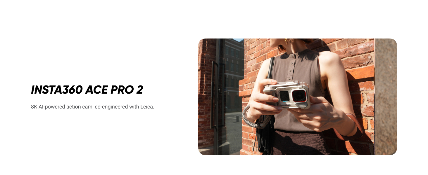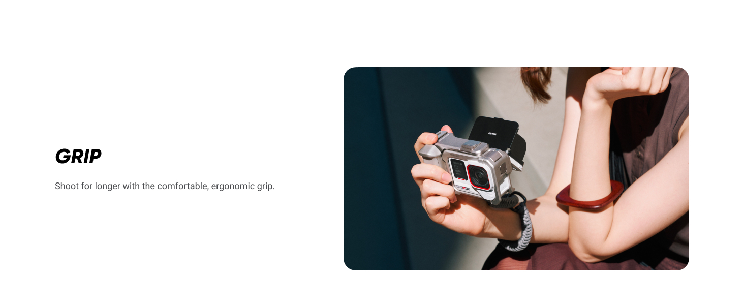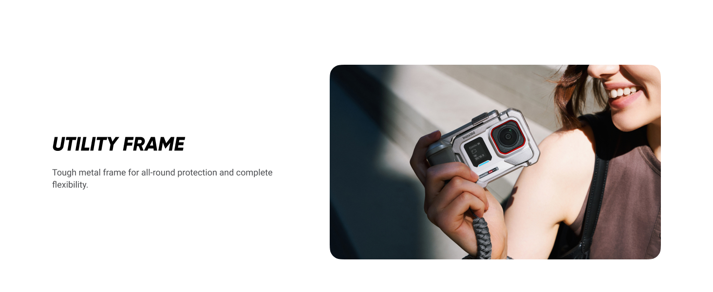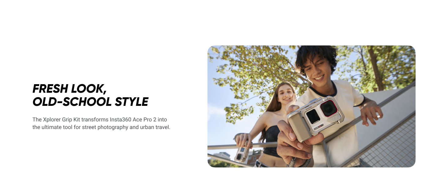 Merchant video- FRESH NEW LOOK, OLD-SCHOOL STYLE: Stand out with the Xplorer Grip Kit, designed to transform Insta360 Ace Pro 2 into the ultimate tool for street photography and urban travel. Includes a Grip for added comfort, Utility Frame and Wrist Strap for extra protection, and decorative cold shoe accessories.