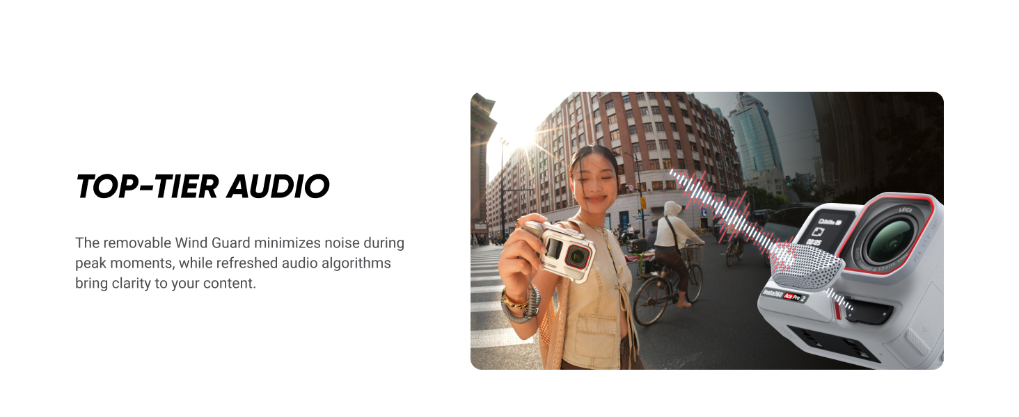- SUPERIOR AUDIO: Innovative hardware meets advanced algorithms. An all-new Wind Guard minimizes wind noise during peak moments, ready to snap on or off as needed. Refreshed audio algorithms bring clarity to your content, immersing your viewers like nothing else.