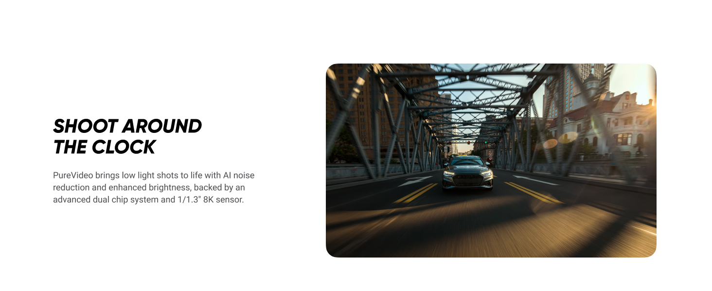 - LOW LIGHT EXCELLENCE: PureVideo Mode redefines low light shooting in an action camera, now supported up to 4K60fps. AI noise reduction ensures crisp details, while enhanced brightness brings your low light shots to life.