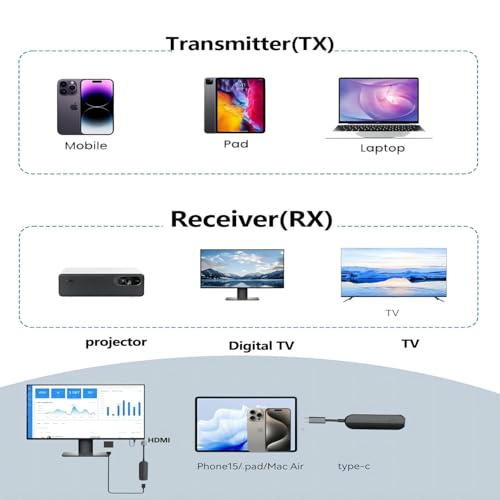 - 【How to Use Wireless HDMI Cable】Automatic pairing, plug and play, no Network or Bluetooth required. Simply connect the Transmitter (TX) to the HDMI port of an output device such as a laptop/PC computer. And then connect the Receiver (RX) to the HDMI port of a receiving device such as an HDTV/monitor/projector. The wireless HDMI transmitter and receiver can directly point-to-point high-speed transmission over 5G WiFi, real-time synchronization of audio and video images.