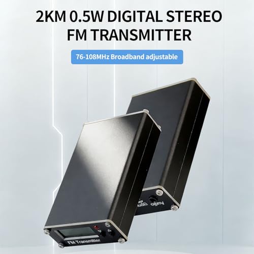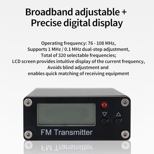 - fm transmitter radio transmitter fm broadcast transmitter fm transmitter low power fm transmitter long range fm transmitter Wide Frequency Range: 0.5W FM Transmitter with digital display, adjustable from 76-108MHz, supports 1MHz or 0.1MHz 2-step adjustment, totaling 320 selectable frequencies