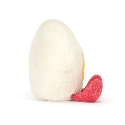 This adorable Jellycat Amuseables Heart Boiled Egg plush brings a smile to breakfast time with its charming design and irresistibly soft texture. Measuring 4.7 inches by 4.7 inches by 2.4 inches, with a 3-inch sitting height, this delightful character features a fluffy white egg white shaped like a heart, a cheerful golden yolk center with an embroidered smiling face, and cute pink sparkly feet. Crafted from premium polyester materials and filled with polyester fibers and PE beans for the perfect cuddly weight, this whimsical companion is perfect for collectors of quirky plush toys or anyone who appreciates food-themed characters with personality. The hard safety eyes ensure durability while maintaining the egg’s adorable expression. Whether displayed on a desk, shelf, or bed, or given as a thoughtful gift, this heart-shaped egg friend adds a touch of playful charm to any space and makes every day feel a little sunnier.