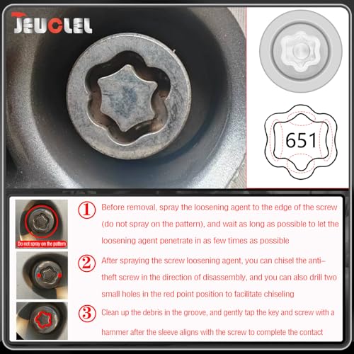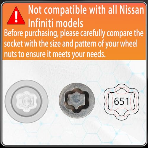 - Ideal Tool: JEUCLEL 651 wheel locking nut key for Nissan Infiniti, used to remove and install wheel anti-theft nuts. A wheel locking nut is prized for its durability, convenience, and practicality, making it an indispensable tool for automotive maintenance and repairs. If you are not sure, please contact us to help you determine. (Please note that it is not suitable for use with pneumatically driven tools).
