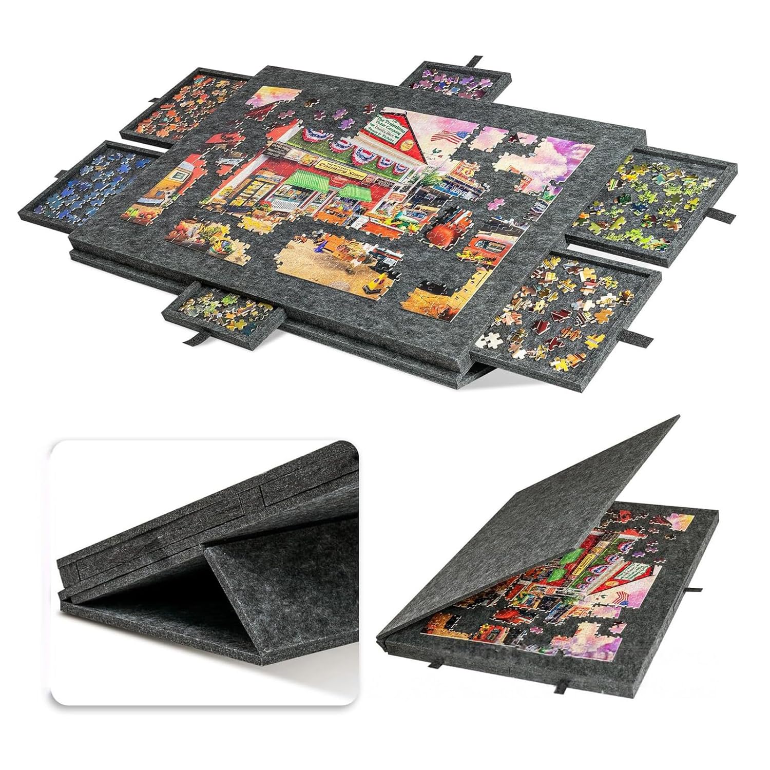 This foldable jigsaw puzzle board features six sorting drawers and a reversible cover (doubling as an inclined stand). Its non-slip double-sided felt surface is specifically designed for 1000-piece jigsaw puzzles, enabling you to complete your projects tidily, comfortably and efficiently.