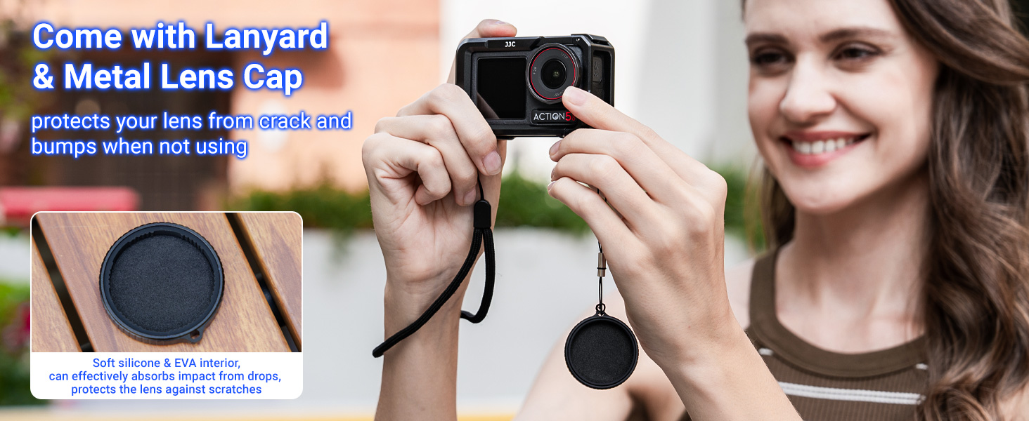 Metal Lens Cover Set & Wrist Strap: This aluminum alloy lens cap can protect your lens from scratches, moisture, dust and fingerprints when you don't use the sports camera or accidentally fall.It also come with a lens cover anti-lose string and wrist strap, which can be hung on the cage to reduce the risk of your camera or lens cover accidentally falling off.