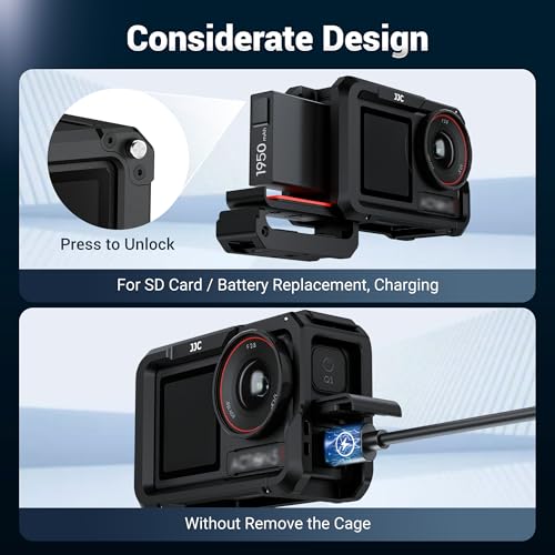 Side Flip-Open Design: The battery cap features a quick-release mechanism. By pressing the unlock button on the back of the cage, the battery cover can be opened directly for convenient battery or TF card replacement without removing the cage. On the opposite side, a hollow-out design is adopted to prevent blocking the USB-C port of the camera.