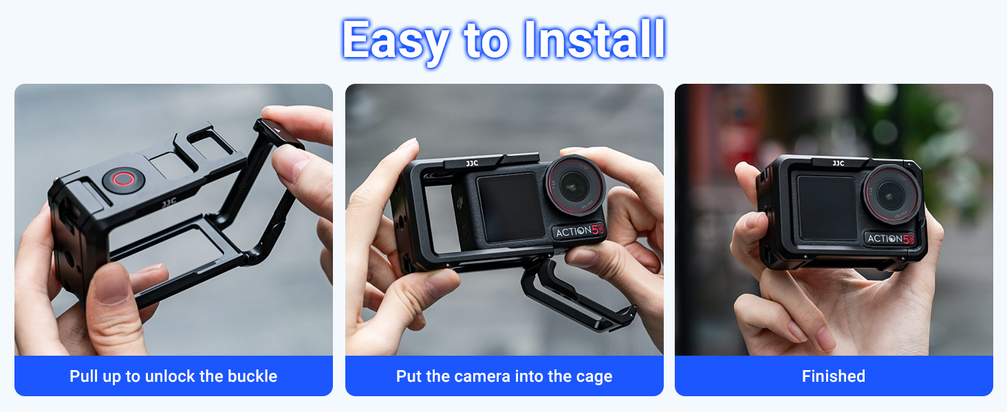 Designed for Osmo Action 5 Pro/4/3: Simply slide the camera into the cage, then fasten the snap-on buckle to complete the installation. The protective cage provides all-round protection for your camera, and offers a variety of standard expansion ports to accommodate your different shooting needs. Package includes: Camera Cage ×1, Metal Lens Cap Set ×1, Wrist Strap ×1.(Not compatible with Osmo Action 6)