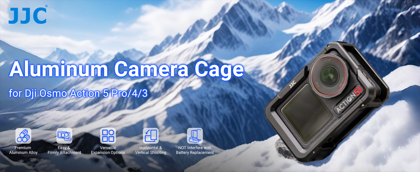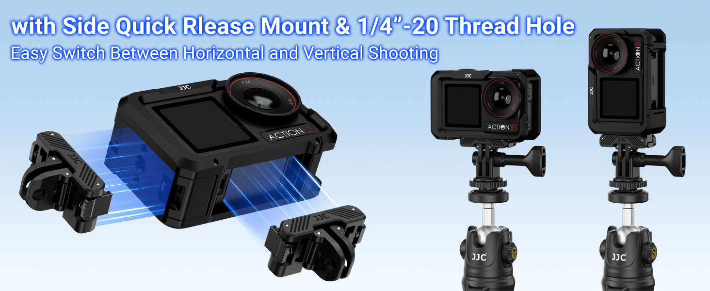 Multi Functional Expansion Cage: The side 1/4"-20 threaded hole and quick-release mount allow you to mount the camera onto a tripod, selfie stick, or Osmo Action 5 Pro/4/3 quick-release adapter. The cage does not impede access to the camera’s bottom, touchscreen, or USB ports, and it supports both horizontal and vertical shooting modes. Featuring a cold shoe mount on the top, this Action 5 Pro metal cage enables the attachment of various accessories such as an LED light or microphone.