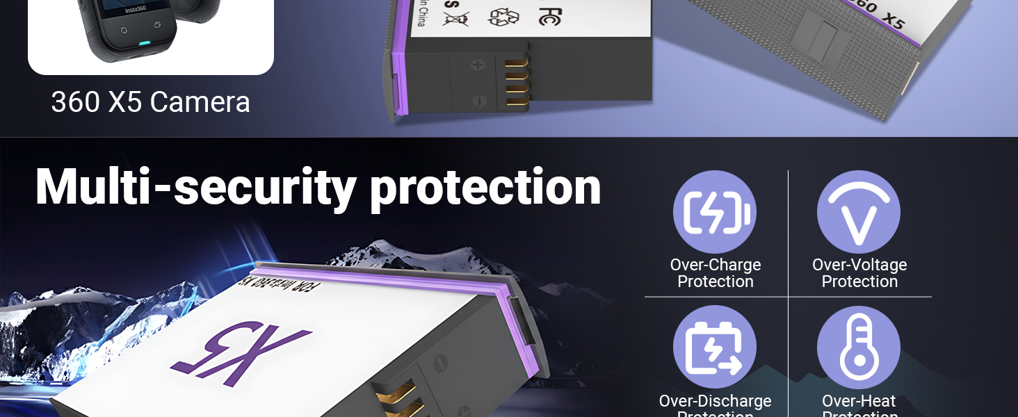 【Multiple protection】Joiry camera battery for Insta360 X5 battery has 10 layers of protection (overcharging, short circuit, high temperature, recovery protection, electrical contact field protection, battery core protection and surge protection, etc.) with high-quality fireproof construction, which ensures complete safety protection for you and your devices.