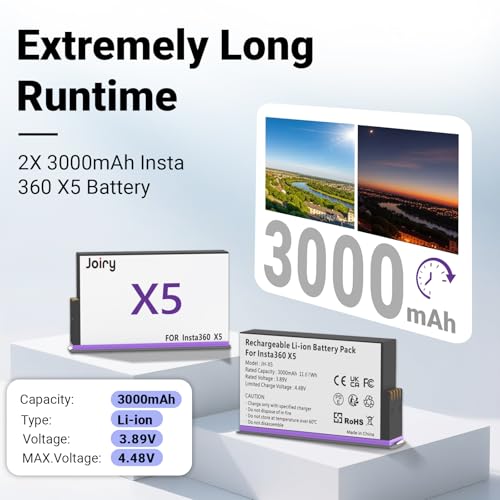 【Product Parameters】For Insta360 X5 Battery Capacity: 3000mAh, Limited Charging Voltage: 4.48V; Rated Energy: 11.67Wh; Rated Voltage: 3.89V. Insta 360 X5 Batteries and Charger are fully compatible with Insta360 X5 camera, so your camera is always ready to use the perfect recording to mak.