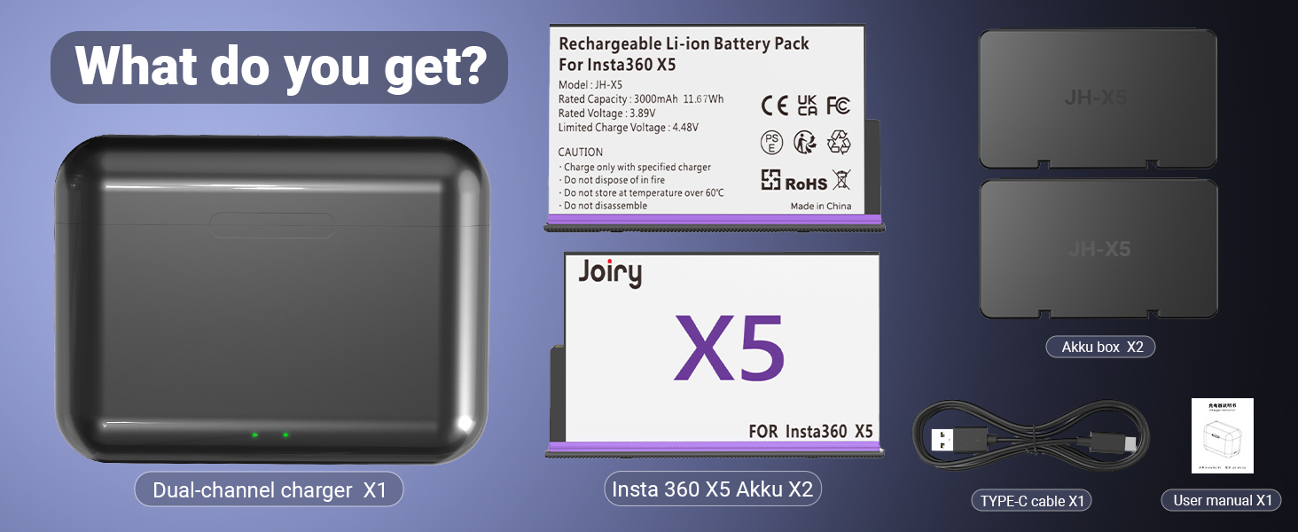 【Package list】2 x replacement batteries for Insta360 X5, 2 x battery box, 1 x charging box charger. To release the full capacity of our battery, we recommend that you perform several discharge and charging cycles (e.g. B. 5 times).