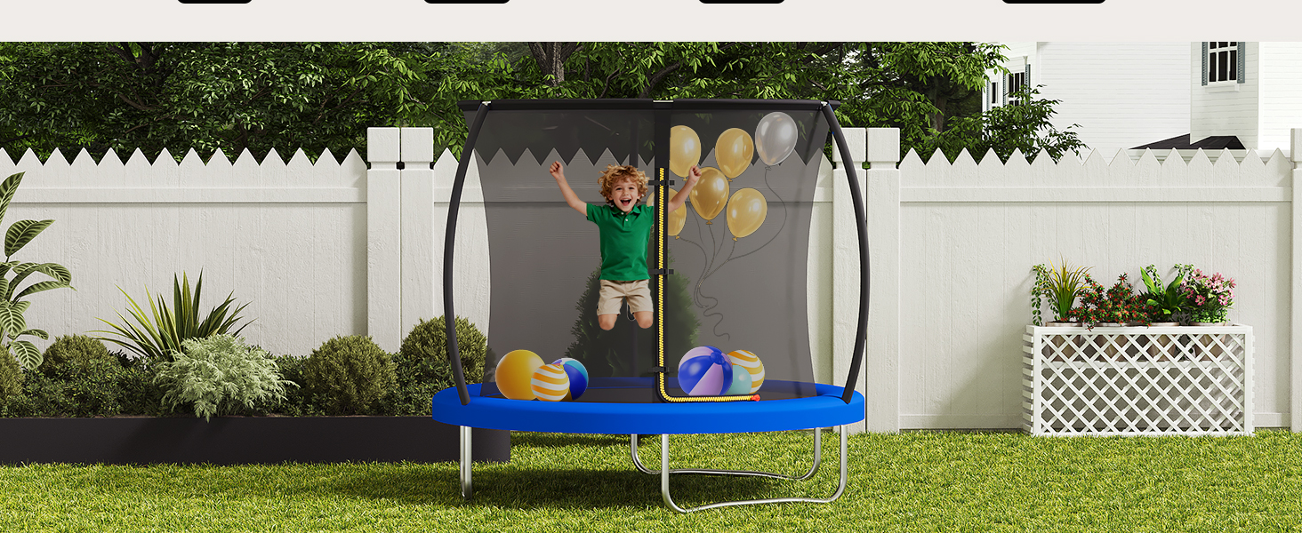 【Safer Curved Pole Enclosure Design】:Unlike traditional straight poles, the enclosure system features gently curved, arched support poles that angle safely away from the jumping area. This intelligent design significantly reduces the risk of accidental contact during bouncing, while the safety net remains securely fixed directly to the mat edge to create a continuous, reliable fall-prevention barrier for worry-free family trampoline fun.