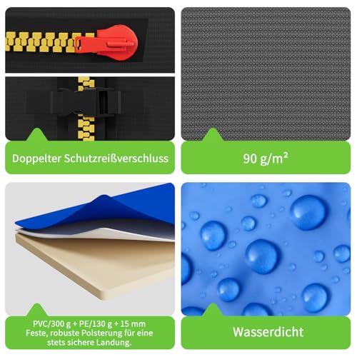 【Outstanding jumping performance】: high-density PE jumping mat (260 g/m²) for stable, long-lasting jumping comfort. Three-layer protection: weatherproof PE layer + 15 mm EPE foam padding + 130 g/m² polyethylene