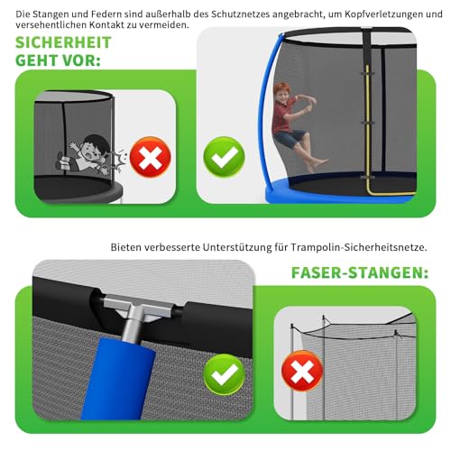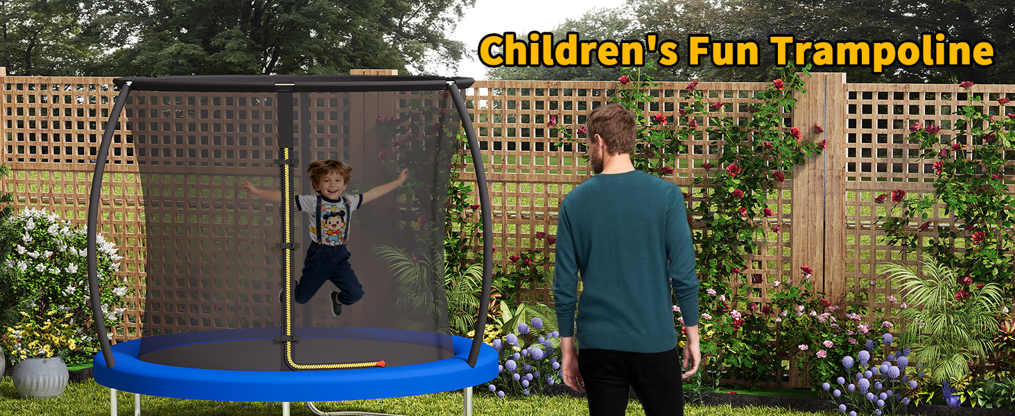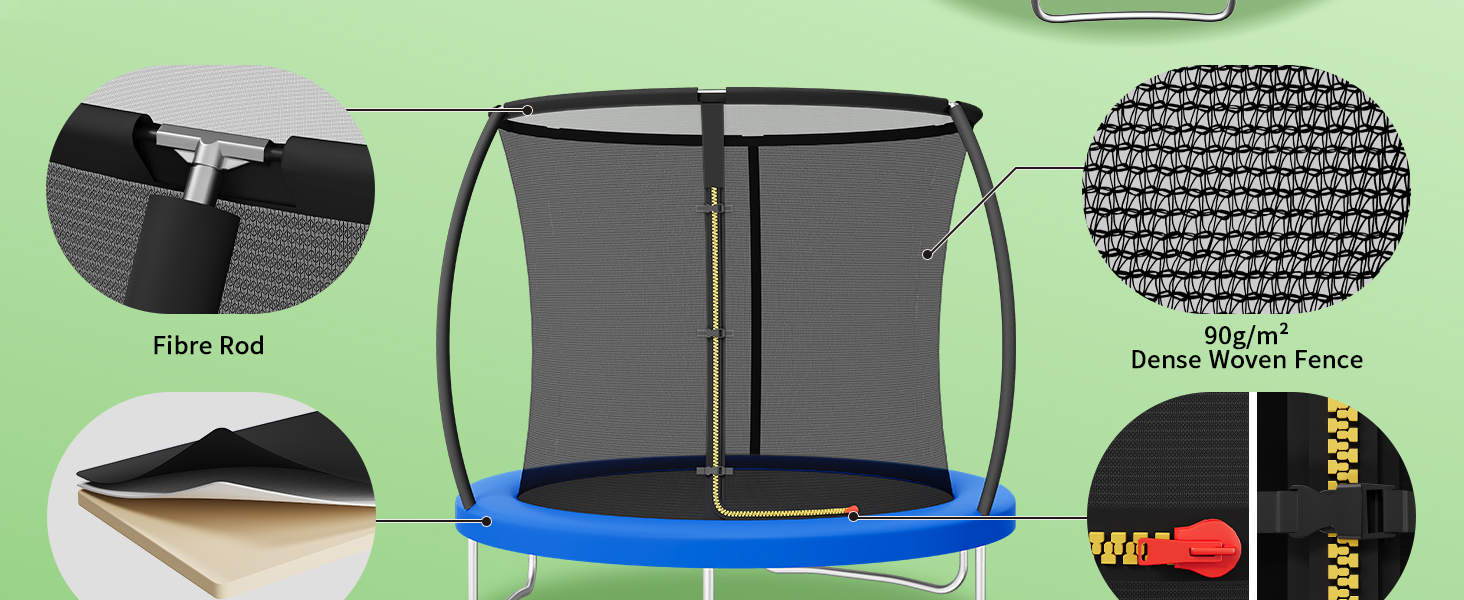 【Reinforced Stability & Structure】: A durable top steel wire ring integrated into the enclosure net maintains the net's shape and tension, preventing sagging or collapse even during vigorous use. This design reinforces the overall stability of the garden trampoline's safety system.
