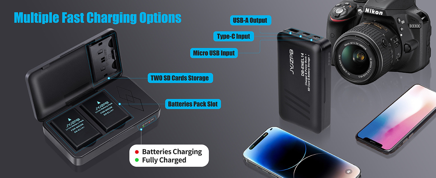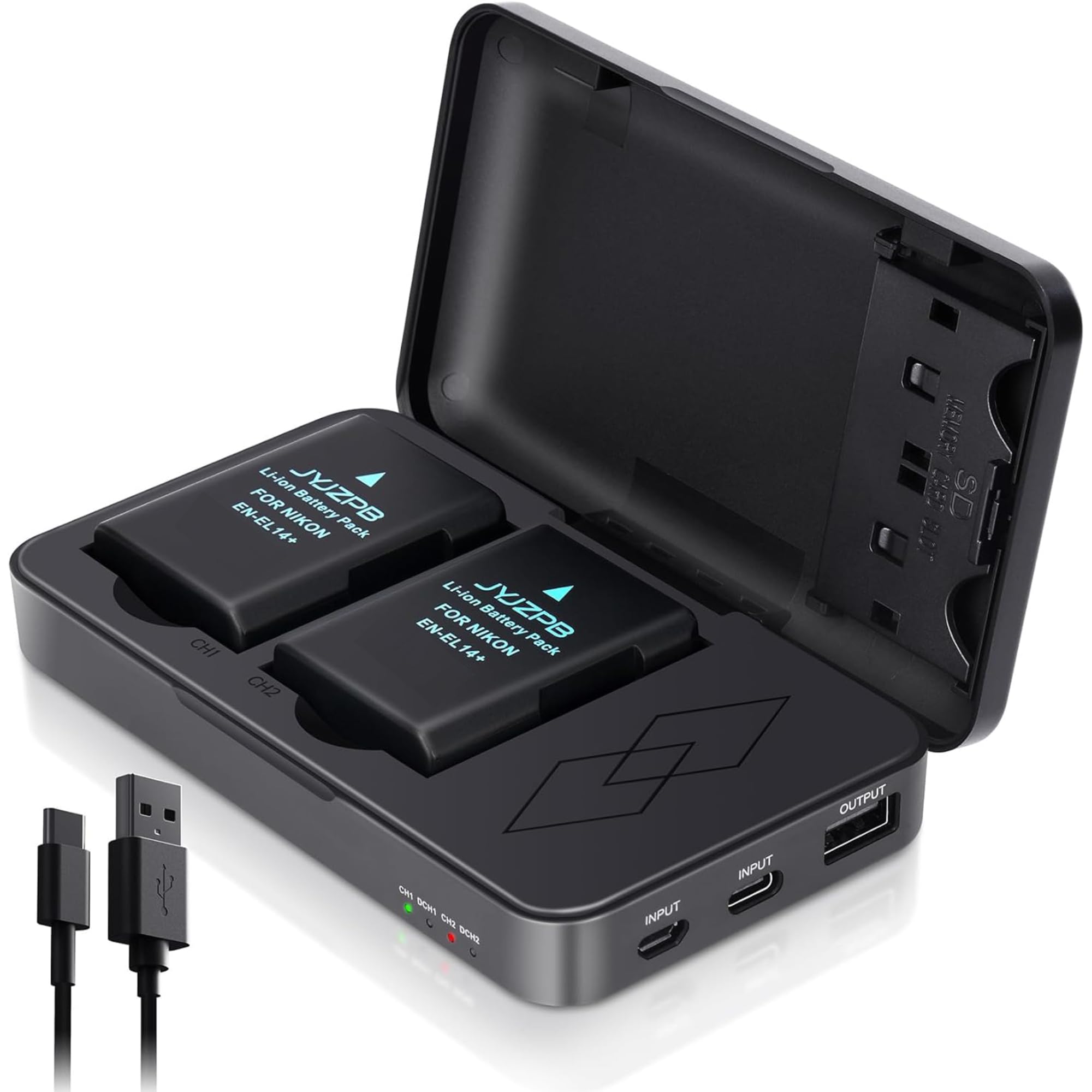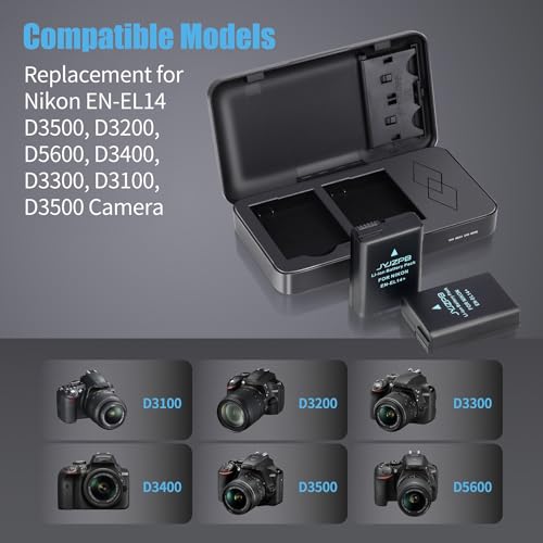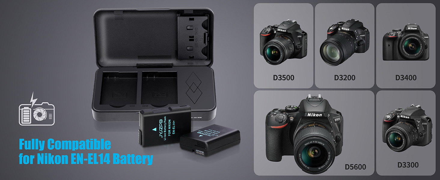 【Multiple Protection】JYJZPB EN-EL14 battery charger case can keep dust from your batteries and your SD cards. Built with multiple circuit protection to prevent the battery. Package Includes 2 * 1100mAh Replacement batteries for Nikon EN-EL14, 1 * Multi Battery Charger Case, and 1 * Micro USB Cable.