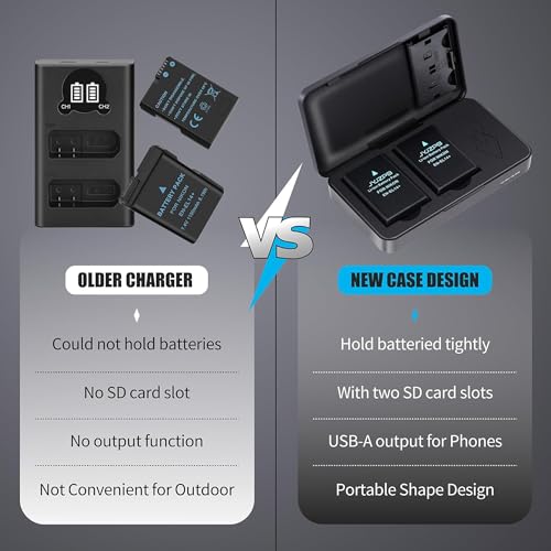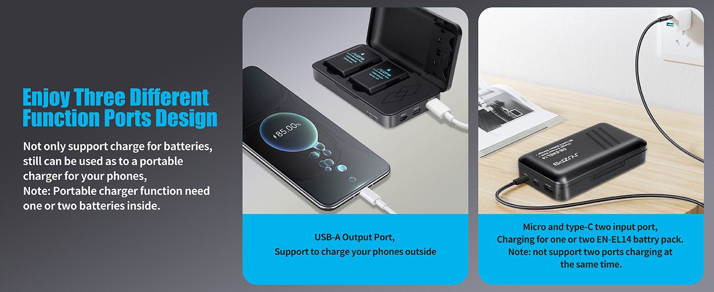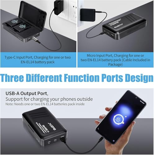 【Multi-Function DB-ENEL14 Battery Charger Case】Upgrated Four-in-one charger case. Extra two replacement batteries for Nikon EN-EL14, also could as a storage case to store two for Nikon EN-EL14 batteries and two SD cards. What's more, it can be extra power to charge your phones. (Note: This portable charger function requires an EN-EL14 battery as a power source.)