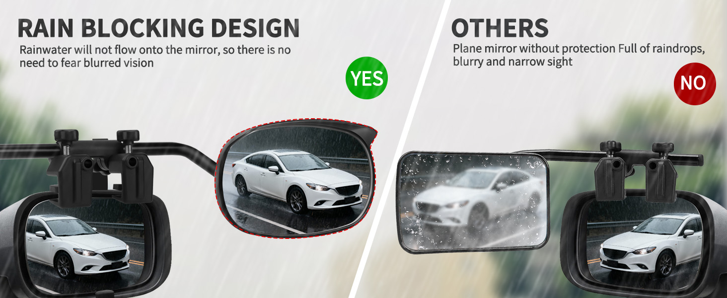 Rain Guard Design: Say goodbye to blurred rear-view mirrors in the rain! The motorhome exterior mirror extension incorporates a rain deflector design, blocking rainfall to prevent droplets from obscuring the mirror surface. Innovative design ensures clear visibility in extreme weather, enhancing driving safety