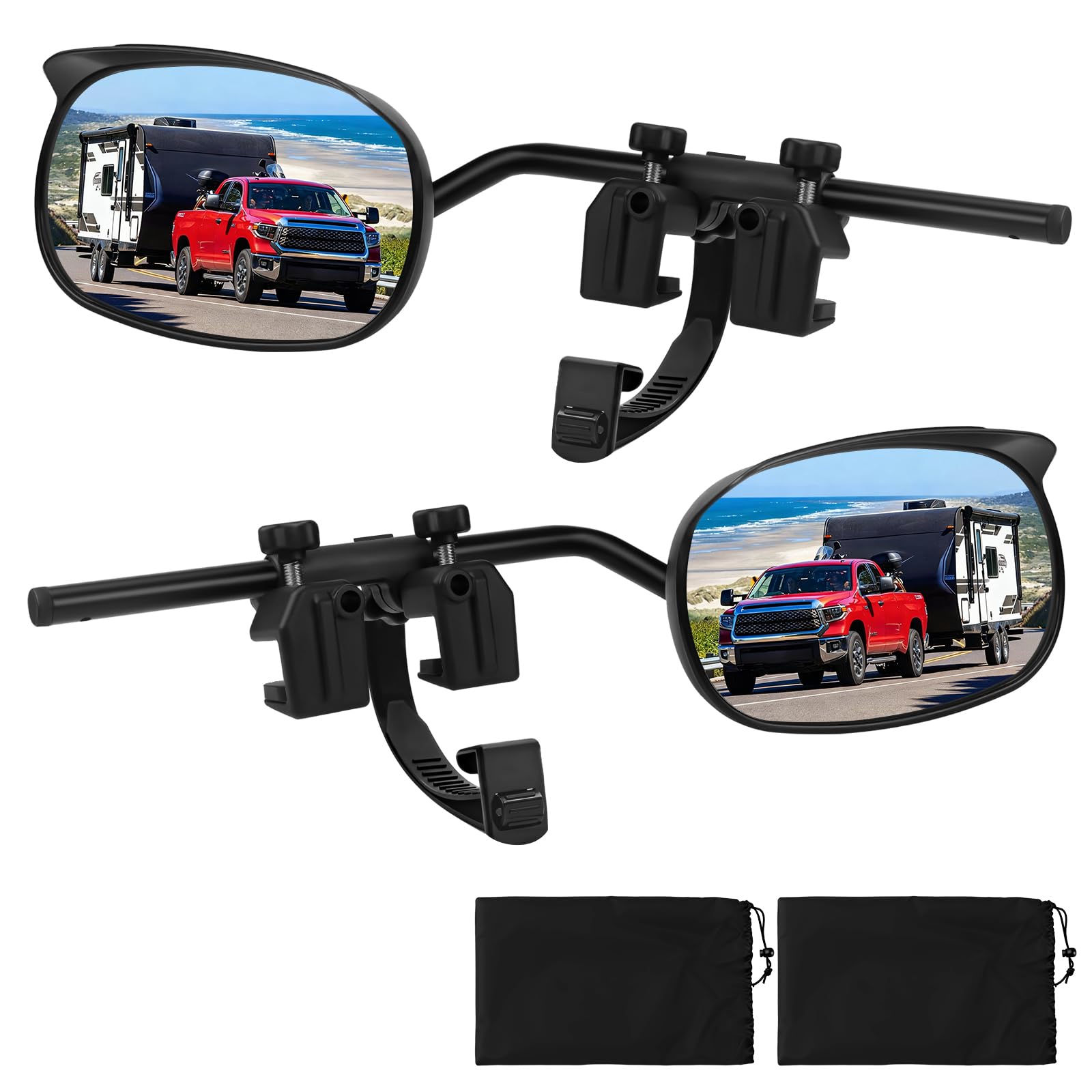 Tool-Free Quick Installation: Simply clip the trailer mirror extender onto your caravan's rear-view mirror, tighten the screw, and secure the rubber strap to firmly position it where required. Installation is swift and removal is rapid, compatible with a wide range of vehicle models. Includes two storage pouches for convenient storage when not in use