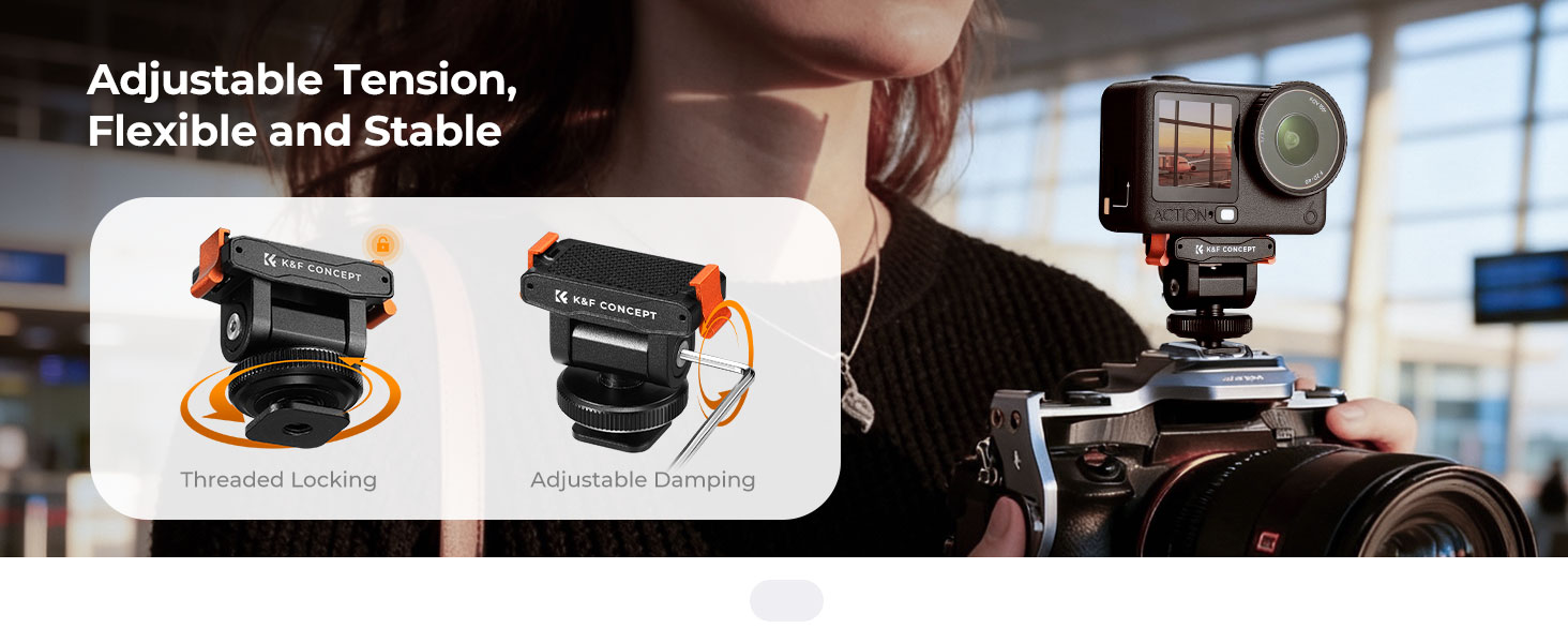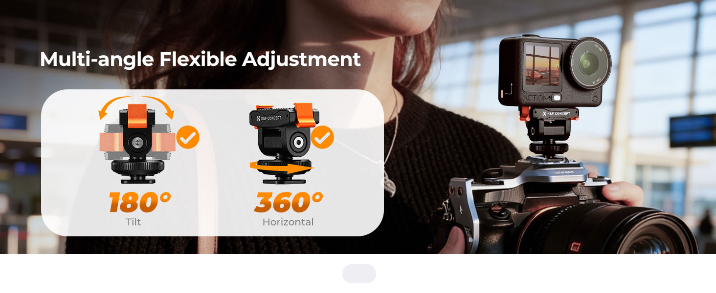 - Flexible Angle Adjustment: The cold shoe mount offers ± 90° tilt and 360° swivel adjustments, adjustable damping pivot design allowing for easy switching between dynamic tracking and fixed angle shooting.