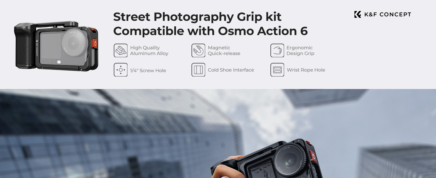 Compatible with DJI OSMO ACTION 6 -Hand grip specifically engineered for the DJI OSMO ACTION 6. Crafted from precision CNC-machined aluminium alloy. Ensures no obstruction to buttons, microphone, or charging port. Battery compartment allows for quick opening and replacement.