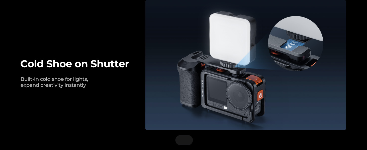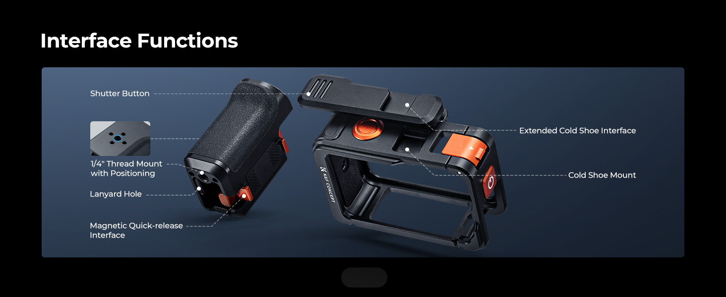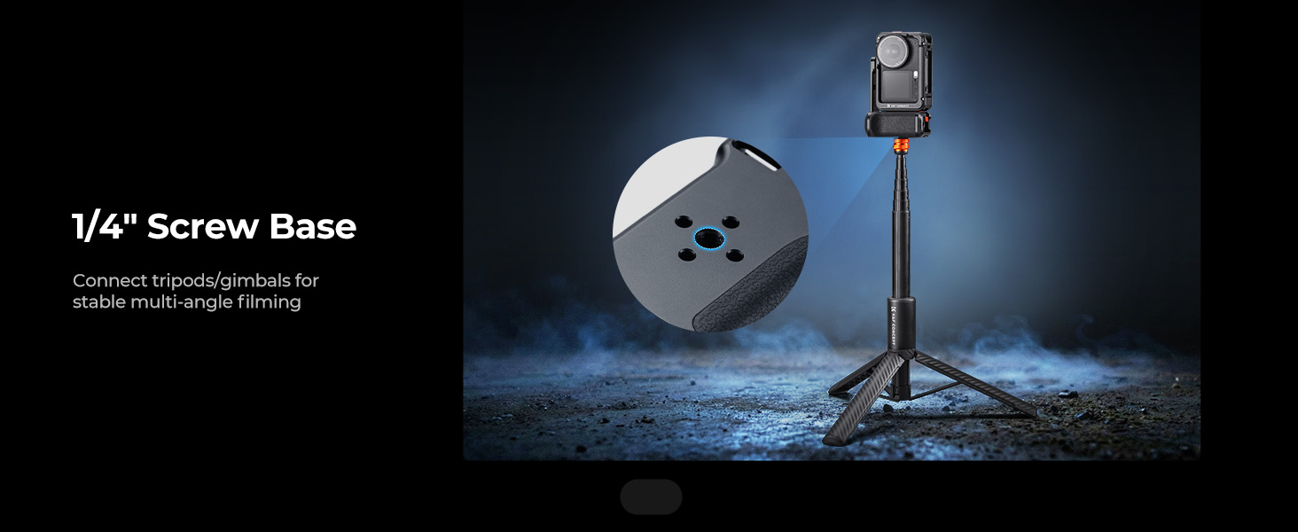 Wide Compatibility: Designed to work seamlessly with tripods, selfie sticks, cold shoe lighting, action camera accessories, and other standard gear. On the "Cage”: 1x Cold Shoe Mount, 1x 1/4" Threaded Mount, 1x Magnetic Quick-Release Mount. On the Handle: 1x Cold Shoe Mount, 2x 1/4" Threaded Mounts, 1x Magnetic Quick-Release Mount.